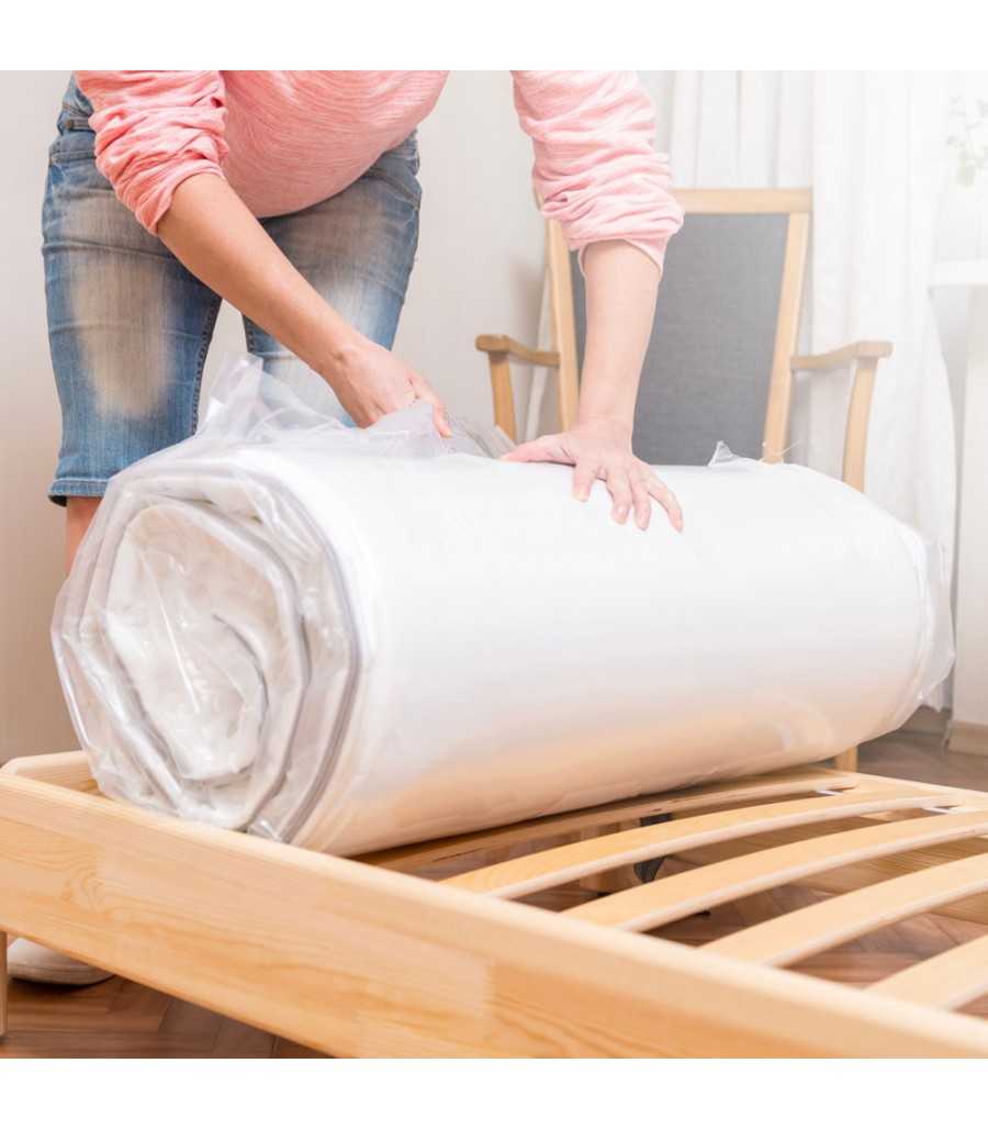 - Materasso arrotolato imballato sotto vuoto in doppio cellophane per un trasporto comodo, ecologico ed economico per una riduzione del 90% dell’ingombro per una facile movimentazione.